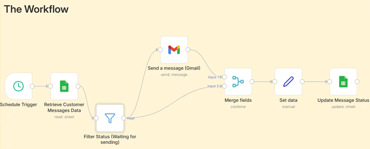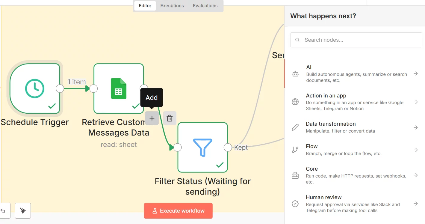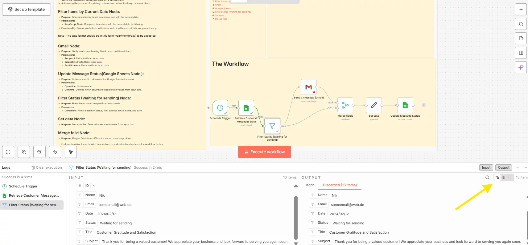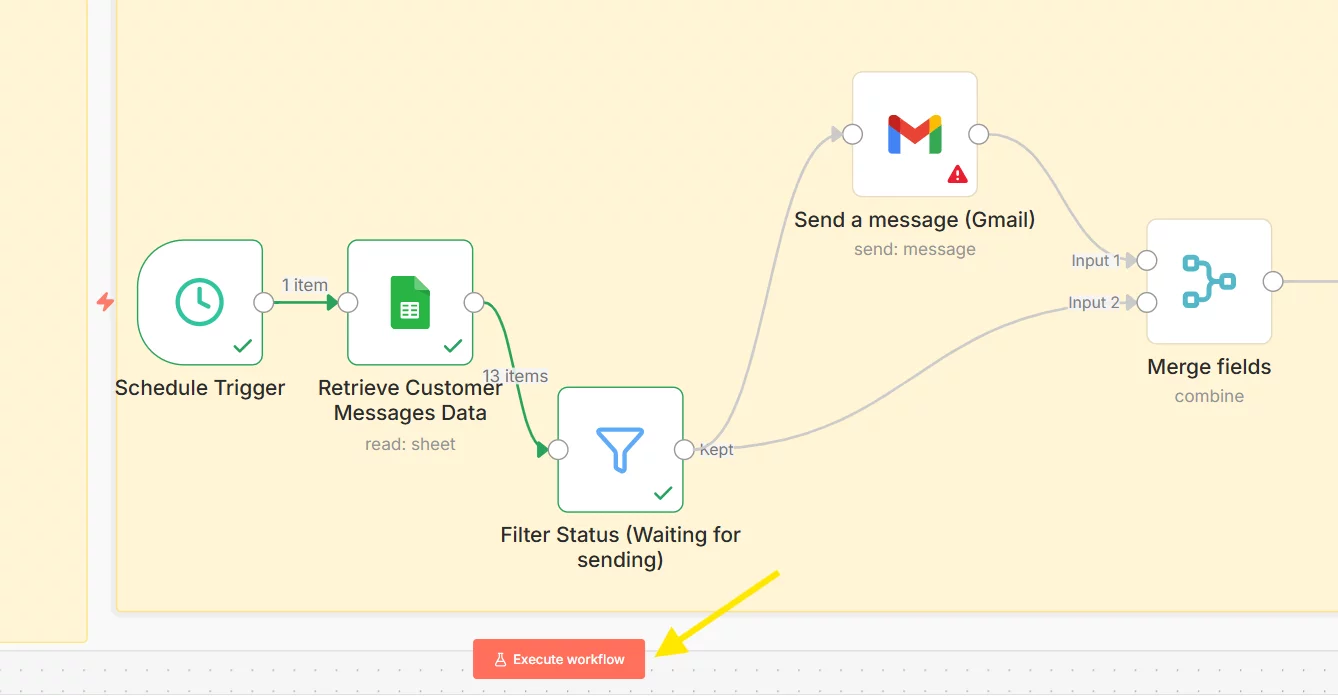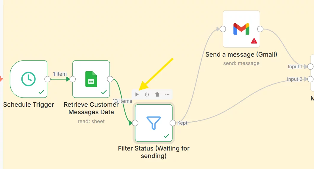 • Настройте ноду Google Sheets, чтобы сообщения падали в таблицу.