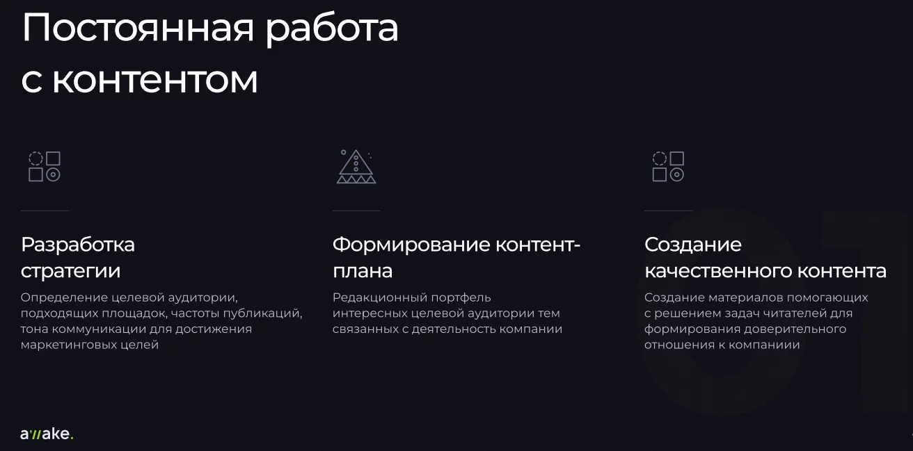 Разработку сайта, его поддержку и контент-маркетинг можно поручить специалистам маркетингового агентства Awake