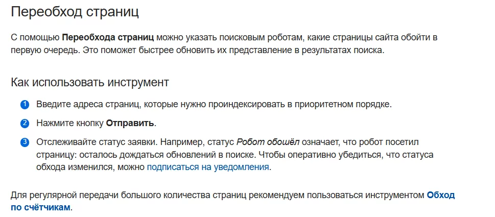 Это не гарантирует мгновенное попадание в топ, но это самый прямой способ поставить новую страницу в очередь на сканирование роботом. Делайте это для самых важных материалов.