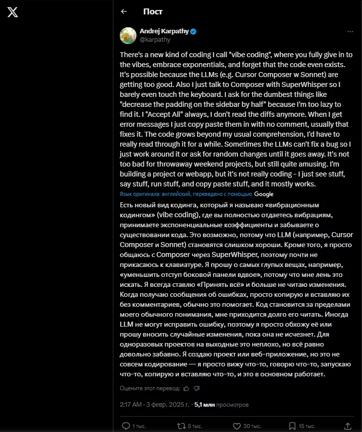 Термин популяризовал Андрей Карпатый, эксперт в ML, бывший директор по ИИ в Tesla и соучредитель в OpenAI. В начале 2025 года он выпустил пост в X (Twitter), который собрал более 5 млн просмотров и тысячу комментариев. Хотя сам по себе кодинг в паре с ИИ существует с 2021 года, с момента появления первых инструментов вроде GitHub Copilot.