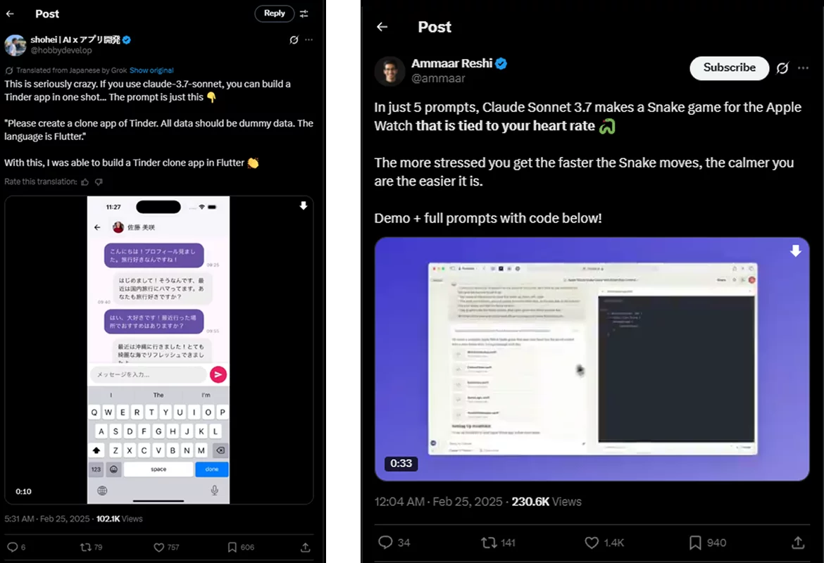 С одной попытки Claude создал копию приложения Tinder с выдуманными данными, а с пяти — игру «Змейка» для Apple Watch, где змейка движется со скоростью сердцебиения пользователя. По этой ссылке сам код игры и промпты для Claude от автора