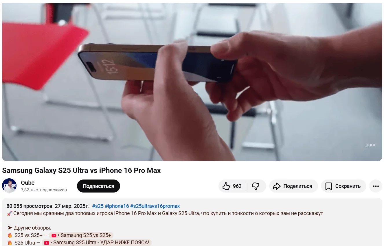 | Видео IT-блогера «Сравнение флагманов 2024: Galaxy S24 vs iPhone 15. Я пользовался обоими телефонами 2 месяца. В этом видео разберу все плюсы, минусы, автономность, камеры в одинаковых условиях и скажу, что в итоге выбрал для себя и почему». | Видео IT-блогера «ЭТО ЛУЧШИЙ СМАРТФОН ДЛЯ СЪЕМКИ! Я в шоке от качества камеры нового Galaxy S24! Заказал его по ССЫЛКЕ В ОПИСАНИИ. У вас есть уникальный шанс получить фирменный подарок от магазина!» |