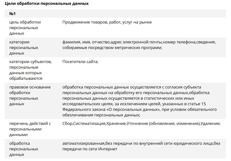 - Указание недостоверных целей обработки.