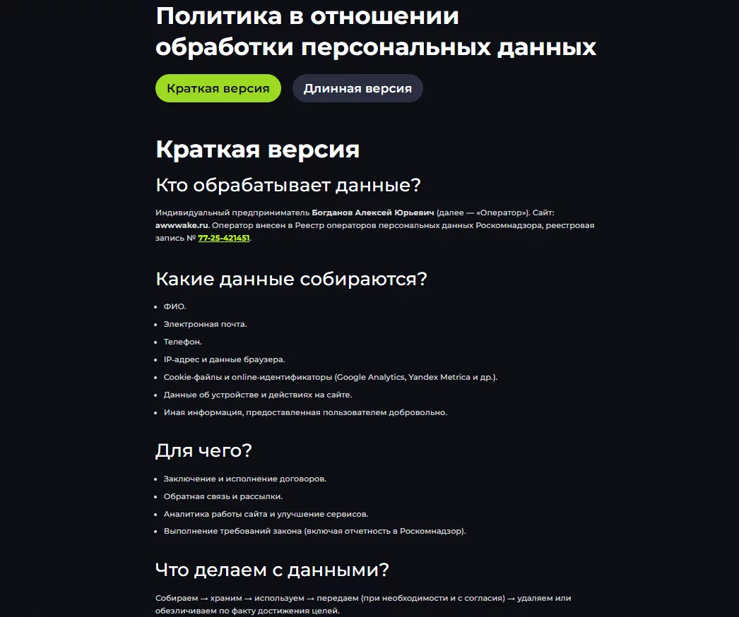 1. Разработать Политику обработки ПДн. Это обязательный документ, который публикуется на сайте. В нем нужно указать: какие данные собираете, зачем, как храните и защищаете.