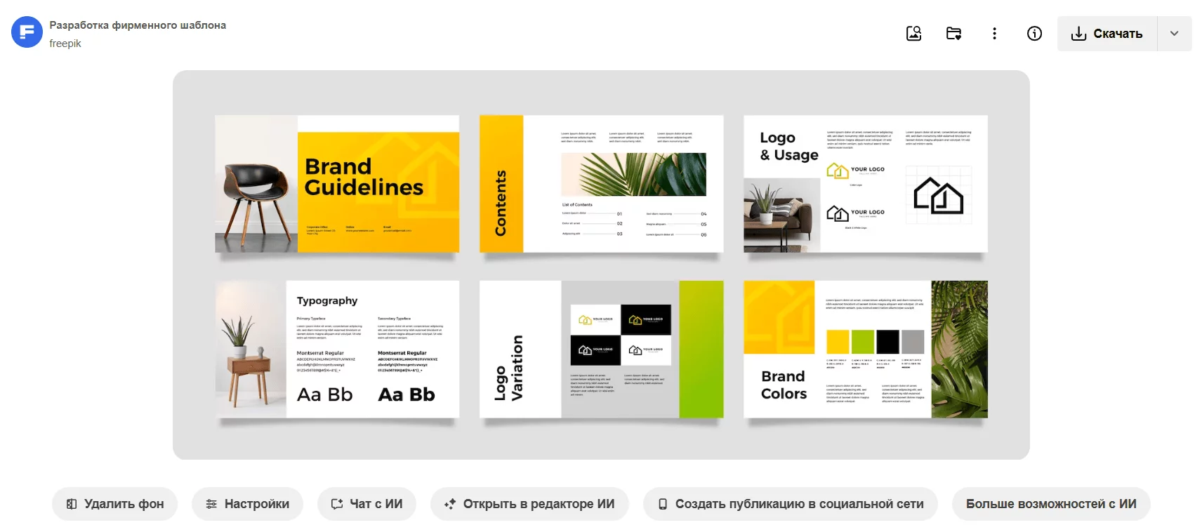 Готовые шаблоны брендбуков в формате PDF можно найти на freepik.com. В них есть все необходимые разделы и подсказки для заполнения.