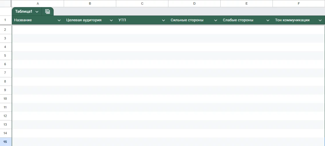 Создайте таблицу-матрицу для сравнения конкурентов. Столбцы: «Название», «Целевая аудитория», «УТП», «Сильные стороны», «Слабые стороны», «Тон коммуникации». Заполнив ее, вы увидите рынок как на шахматной доске.