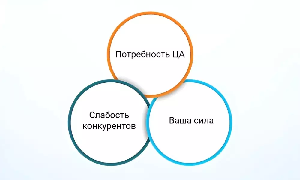 - Найдите «белое пятно» на рынке — точку пересечения незакрытой потребности ЦА, слабости конкурентов и вашей силы.