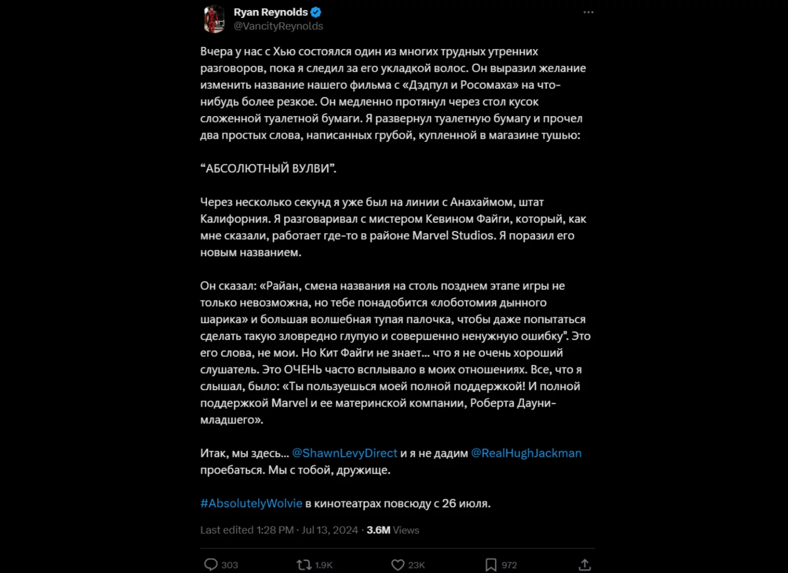 Фух, вроде все важное для старта упомянул! Если суммировать, то вокруг третьего фильма о Дэдпуле уже давно происходила какая-то суета: исполнитель роли Дэдпула Райан Рейнольдс бесконечно ныл о том, как хочет фильм с Хью Джекманом, исполнителем роли Росомахи. Тот показательно отвергал все намеки. Люди следили за драмой в соцсетях. И вдруг покупка Дэдпула Диснеем — а Дисней, как всем известно, семейная компания, вроде как (ЛГБТ-семьи ведь тоже семьи, или нет?). А потом и Джекмен соглашается на фильм! И тизер на Суперкубке!