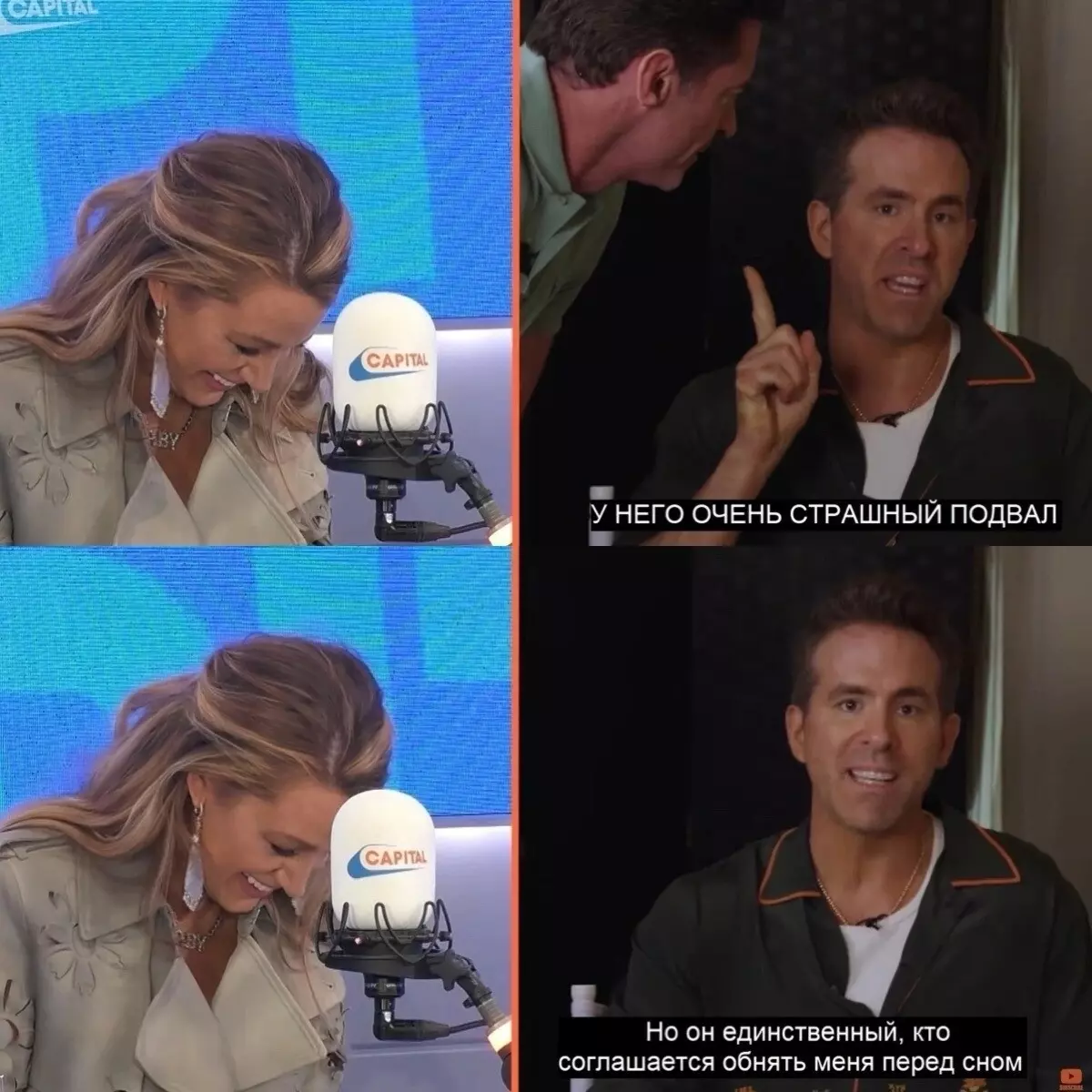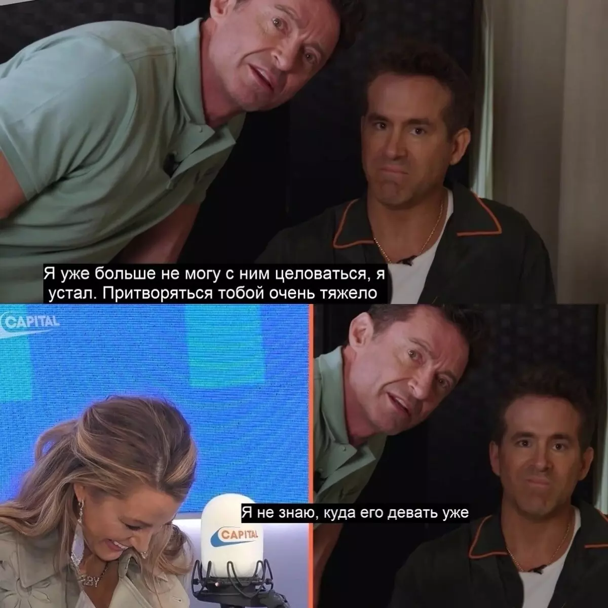 Даже свою личную жизнь Рейнольдс превращает в шоу и юмор. Например, всячески эксплуатирует намеки на его с Хью Джекманом однополую любовь. При этом Рейнольдс женат на актрисе Блейк Лайвли — посмотрите, что происходит, пока его жена находится в промо-туре своего нового фильма: