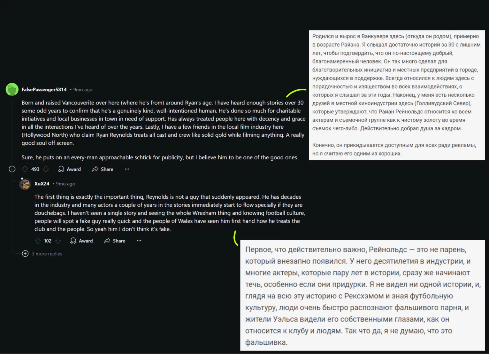 А дальше человек с его родины — Ванкувер, Канада — рассказывает, что Райан является настоящим стереотипным канадцем, очень вежливым и приятным. А еще меценатом. Обращайте внимание на лайки: