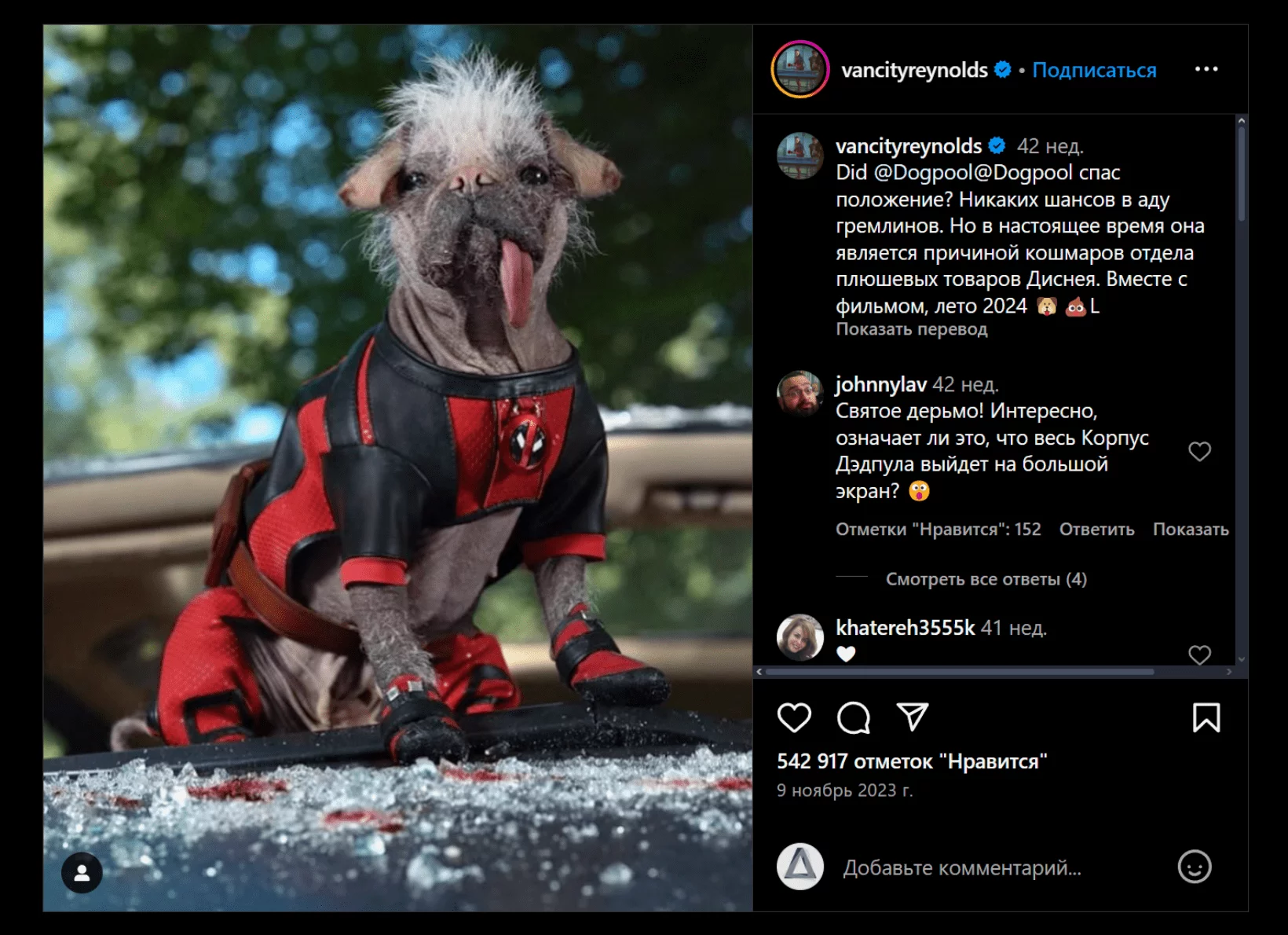 К чему я это. Пост смешной, мемный, с вирусным хештегом — но на другом уровне восприятия он работает еще и на образ Рейнольдса как Дэдпула. Я бы даже сказал, что он работает на драматургию фильма, но об этом поговорим в одном из следующих блоков. А пока едем дальше!