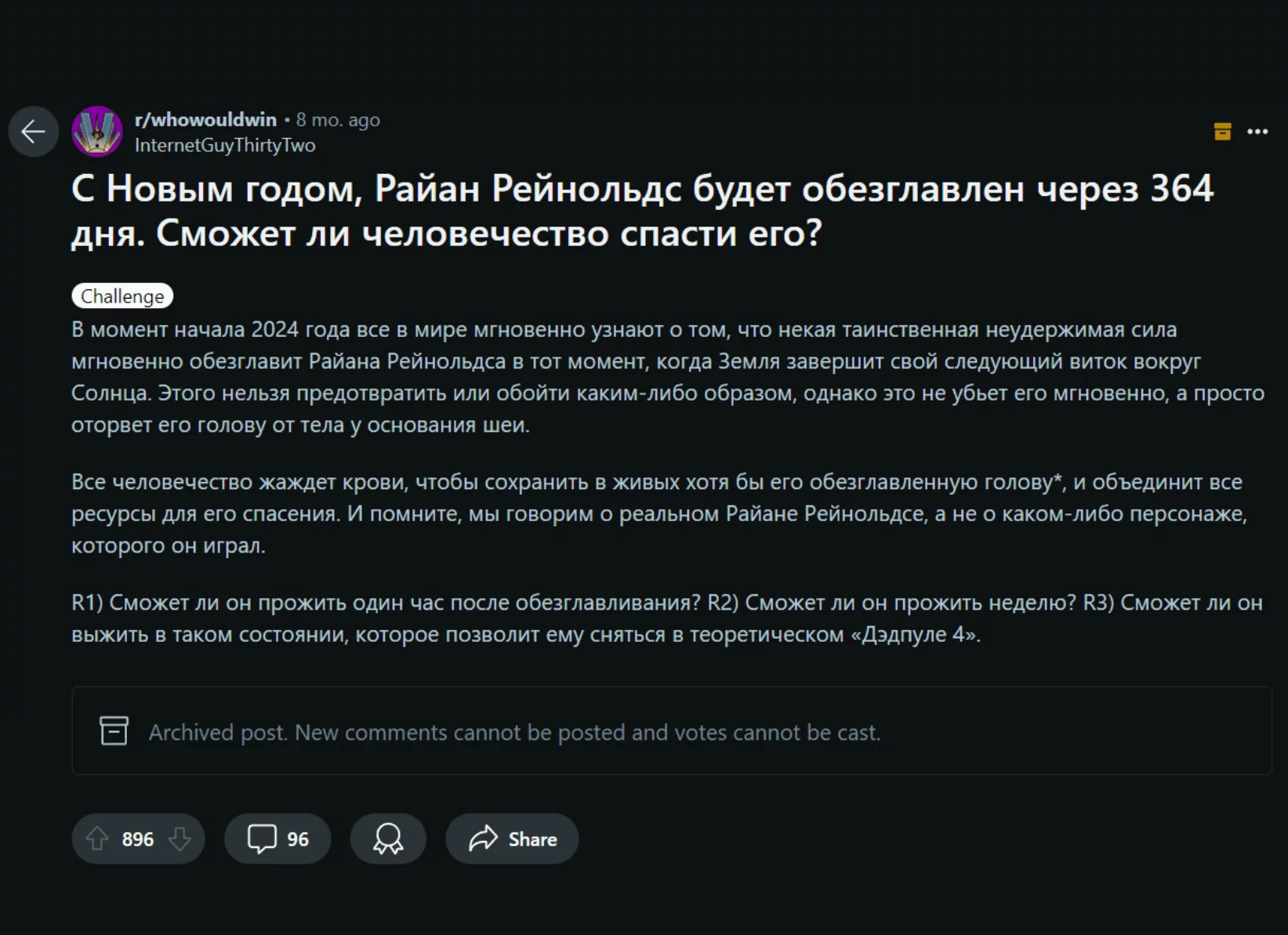 Но вернемся к Райану Рейнольдсу и его репутации комика. Буквально последнее, что хочется показать на эту тему — пост с Реддита с вопросом. Сразу предупреждаю, вопрос жесткий, но это на 100% юмор. Однако на всякий случай прячу скрин с переводом под спойлер, мало ли, Томми окажется чувствительным мальчиком:
