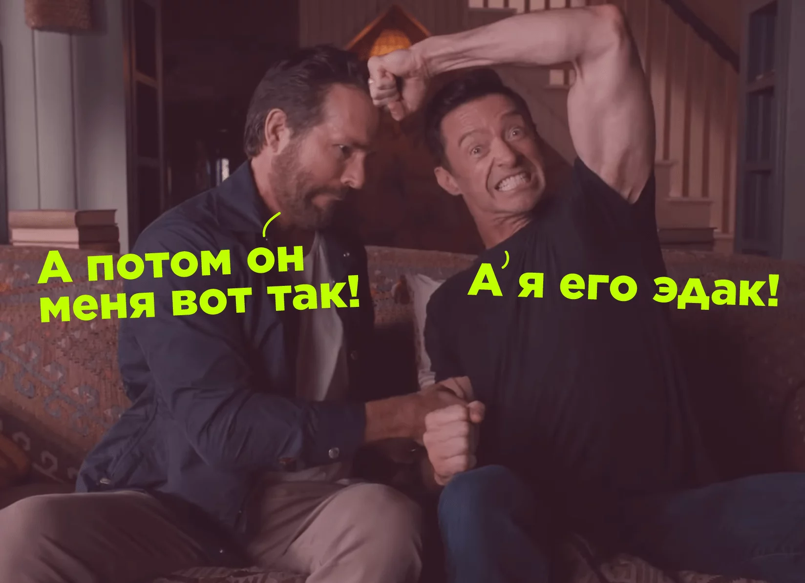 Это очень смешно, самоиронично и мило. Людям всегда интересны трусы звезд, так уж вышло — но в случае Райана все подается с юмором, очень по-доброму, даже когда в кадре шутят на грани. Всем очевидно, что Рейнольдс и Джекман не геи, но подтрунивание над этим создает дополнительное напряжение и распаляет интерес. И это все еще работает на образ Райана-семьянина.