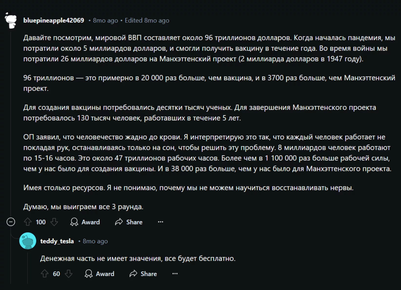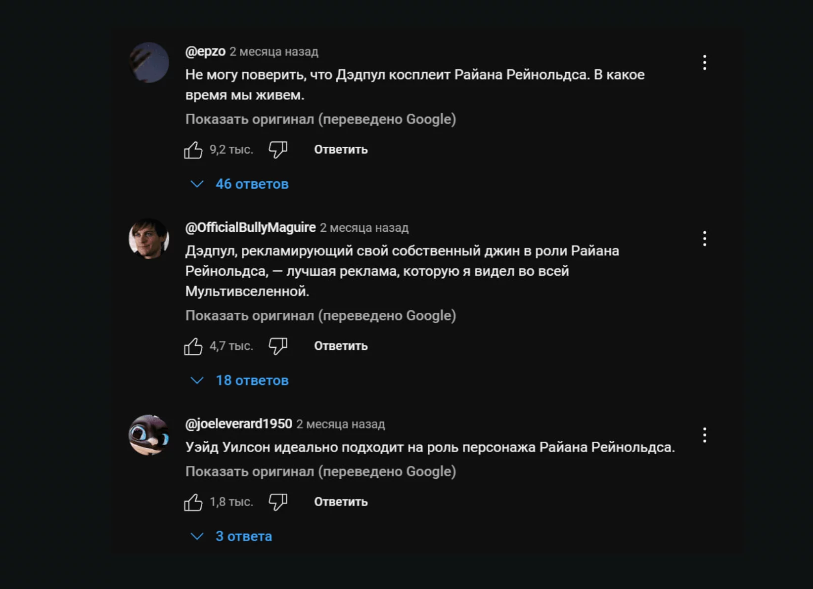 Автор коммента со всей серьезностью заявляет, что вся планета объединится, чтобы спасти жизнь Райана. Ему отвечают, что тут даже считать ничего не надо — все будут работать бесплатно ради этого. Под постом много подобных комментов, смысл которых сводится к тому, что Рейнольдс — чуть ли не лучший представитель человечества эвер.