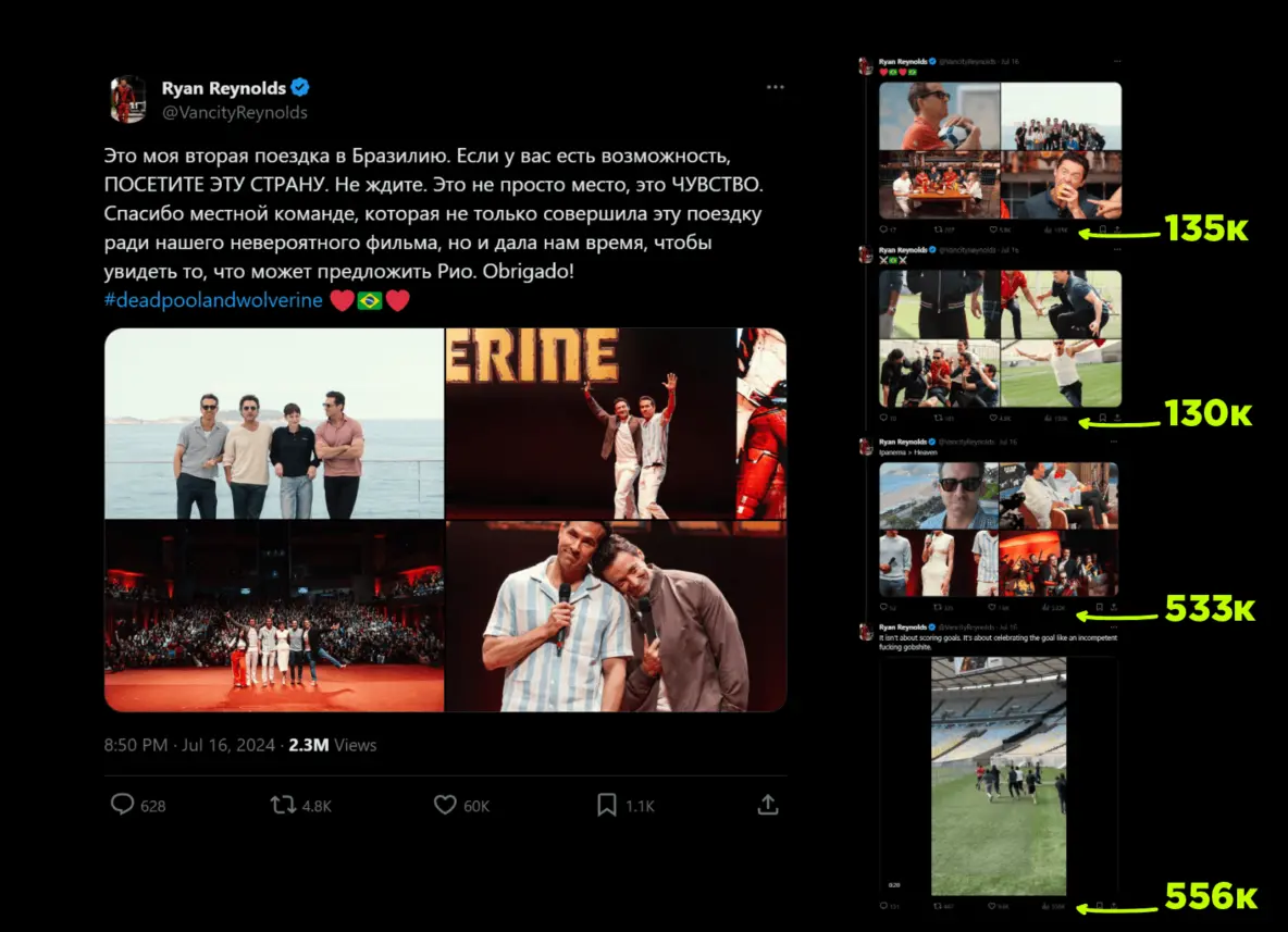 Но когда ты Райан Рейнольдс, который годами работает на аудиторию площадки, практически каждый день публикует посты, в которых эмоционирует и шутит — цифры будут набираться гораздо, гораздо легче. И дело тут не в самой фигуре Райана, а в подходе к ведению соцсетей.
