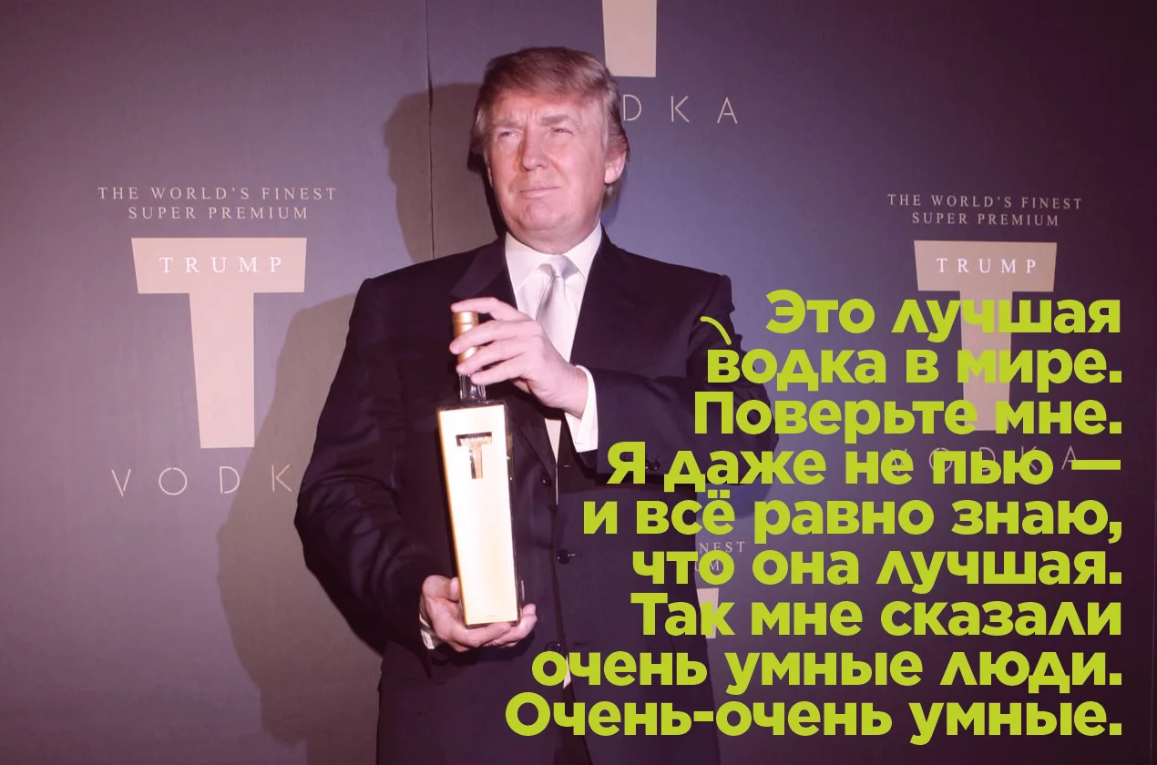 К 2000-м Трамп превратил свою фамилию в бренд и разрешил другим бизнесменам вешать её на свои проекты за деньги. В итоге Трамп Тауэры стоят на Филиппинах, в Уругвае, Турции, Индии, Канаде и Панаме — и Трамп ими не владеет. Он владеет только правом на имя. Но фамилию он лепил вообще на всё: Университет Трампа, Трамп-ипотека, Трамп-водка, стейки Trump Steaks, мужская одежда, духи, настольная игра Trump: The Game, питьевая вода Trump Ice, и даже MLM-компания Trump Network, которая продавала витамины, подобранные по анализу мочи.