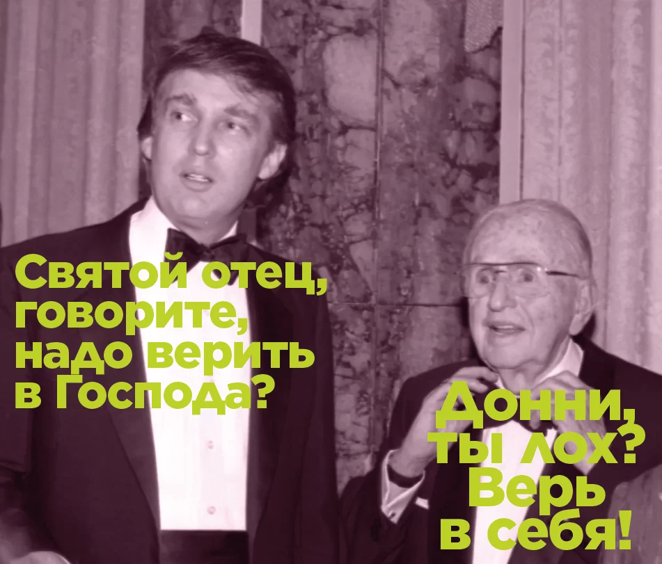 Самая главная фишка Трампа, без которой всё остальное не имело бы смысла, восходит к одному конкретному человеку — проповеднику Норману Винсенту Пилу. В 1952 году Пил написал книгу «Сила позитивного мышления», которая стала бешеным бестселлером. Родители Трампа настолько вдохновились его философией, что стали ходить в церковь, где Пил был настоятелем. Дональду тогда было шесть лет. Позже, уже взрослым, Трамп сыграет свадьбу в той же манхэттенской церкви.