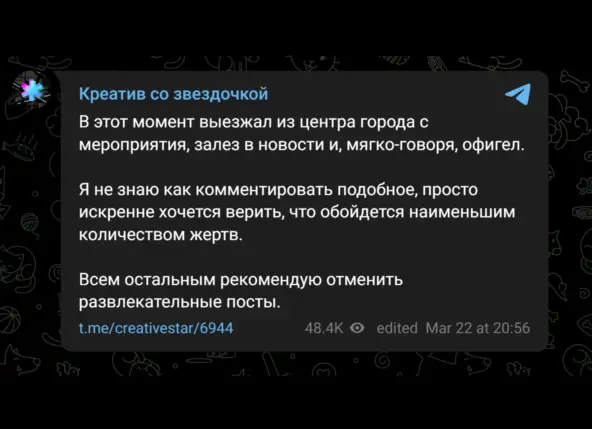 - Люди об этом не просили – это буквально так. Когда я подписываюсь на канал «Креатив со звездочкой» (153к подписчиков) – я подписываюсь на канал про маркетинг и медиа. Это буквально позиционирование канала, указанное в описании. И в основном я получаю то, зачем и пришел – посты по маркетингу. Но в день событий Крокуса именно от этого канала я узнал о событиях в Крокусе и о том, что всем нужно отменить развлекательные посты.Может показаться, что это хорошо – канал информирует. Но я, как и другие читатели, подписывался не за этим – а за контентом по маркетингу. Если же кто-то подписался на развлекательный канал – значит он хочет получить порцию развлечения.