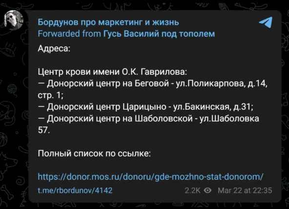 В ту же корзину посты а-ля «смотрите, вот адреса центров сдачи крови». Вы просто вдумайтесь: а для кого этот пост? В каком городе эти адреса? Зачем сдавать кровь? Почему автор думает, что человеку в принципе нужны эти адреса — неужели человек в какой-то беде и не сможет их нагуглить буквально за 30 секунд?