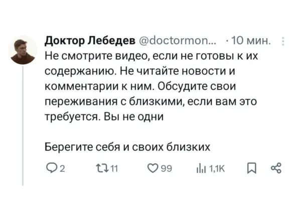 Твиттерский психиатр предлагает не смотреть жестокие кадры, если не готовы к ним. А ведь многие действительно смотрят, просто потому что чувствуют, что обязаны это видеть, обязаны разделить ужас. Нет, не обязаны.