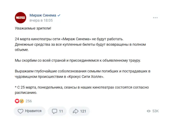 Но что неправильно — так это бездумный популизм ради… популизма. Под популизмом я подразумеваю свечки в сторис (от людей — супер, ок, но не от компаний), посты «скорбим вместе с вами». На мой взгляд, более чем очевидно, что по-настоящему скорбеть вместе с пострадавшими и семьями пострадавших не сможет никто. Выразить сочувствие — да, хорошо. Но какой толк семье погибшего в Москве от того, что кинотеатр в Мурманске не будет показывать фильмы? Какой толк от того, что детский парк развлечений будет закрыт — неужели мы хотим наказать сами себя за этот террор? Конечно нет! Но по факту получается, что таким образом бизнес это делает.
