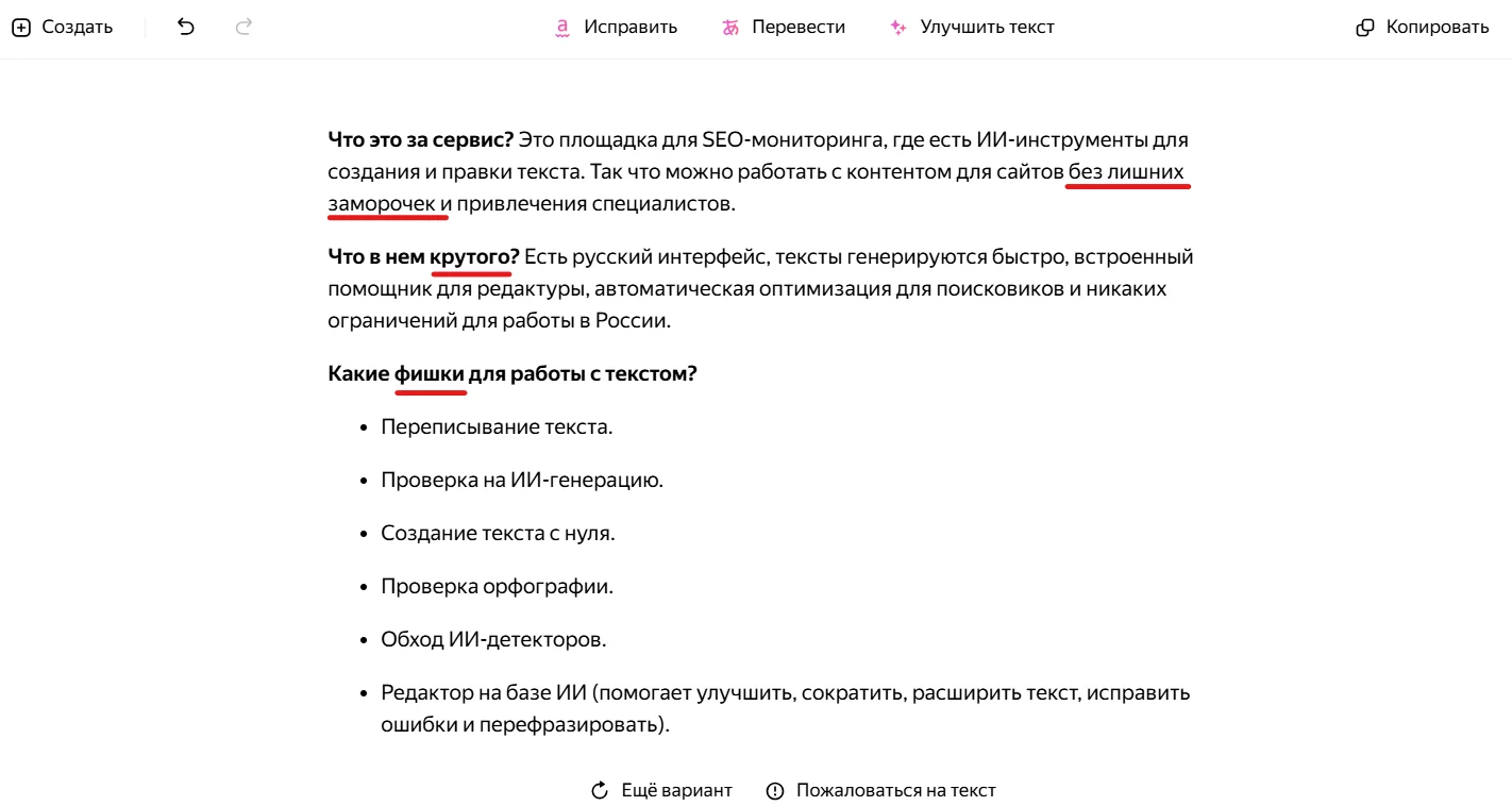 - Проверьте результат. Так как мы выбрали разговорный стиль, нейросеть добавила в текст слова из жаргона. Нужно проверить, не ошиблась ли она в контексте или стилистике. При необходимости можно уточнить запрос и повторить генерацию.