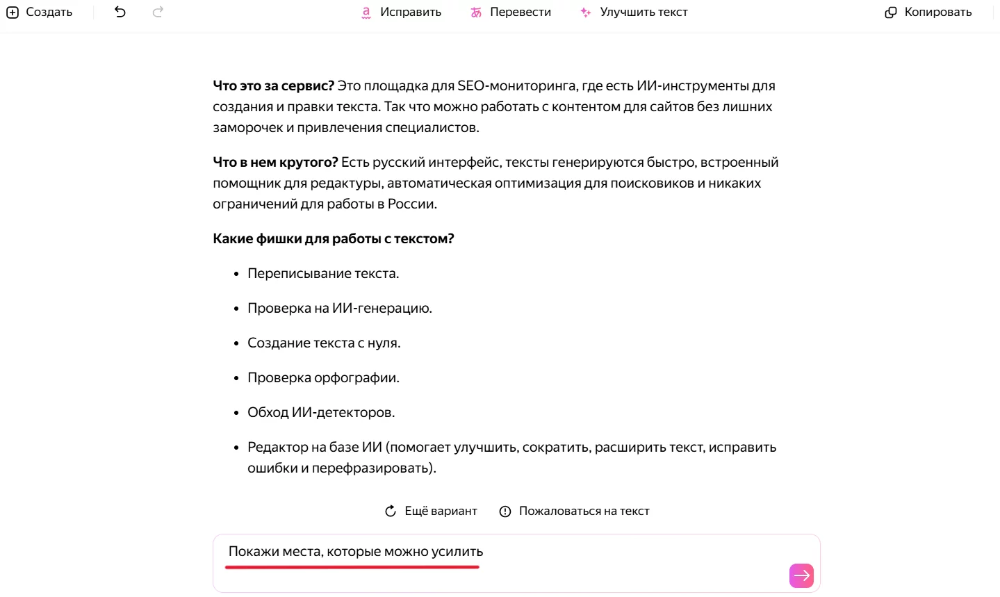 - Получите рекомендации и отредактируйте. В том же чате вы можете попросить нейросеть указать вам места, которые можно усилить. Далее отредактируйте текст, следуя рекомендациям.