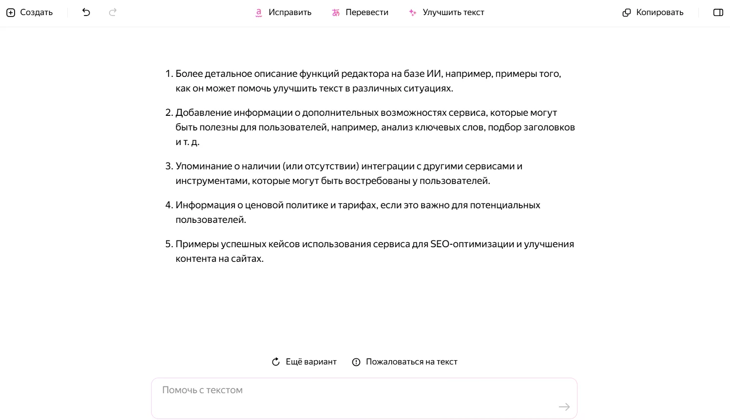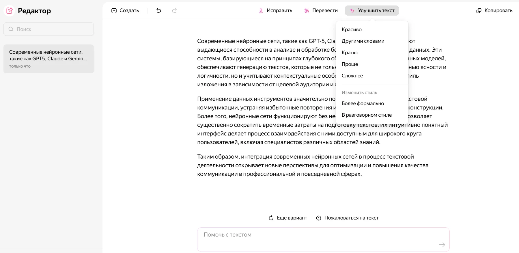 Коротко о сервисе. Бесплатная безлимитная нейросеть для редактирования текста онлайн от Яндекса. Доступна в браузере. Может улучшить текст (переписать, сократить, усложнить
