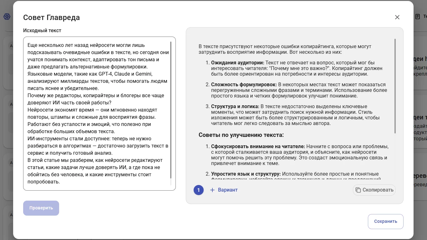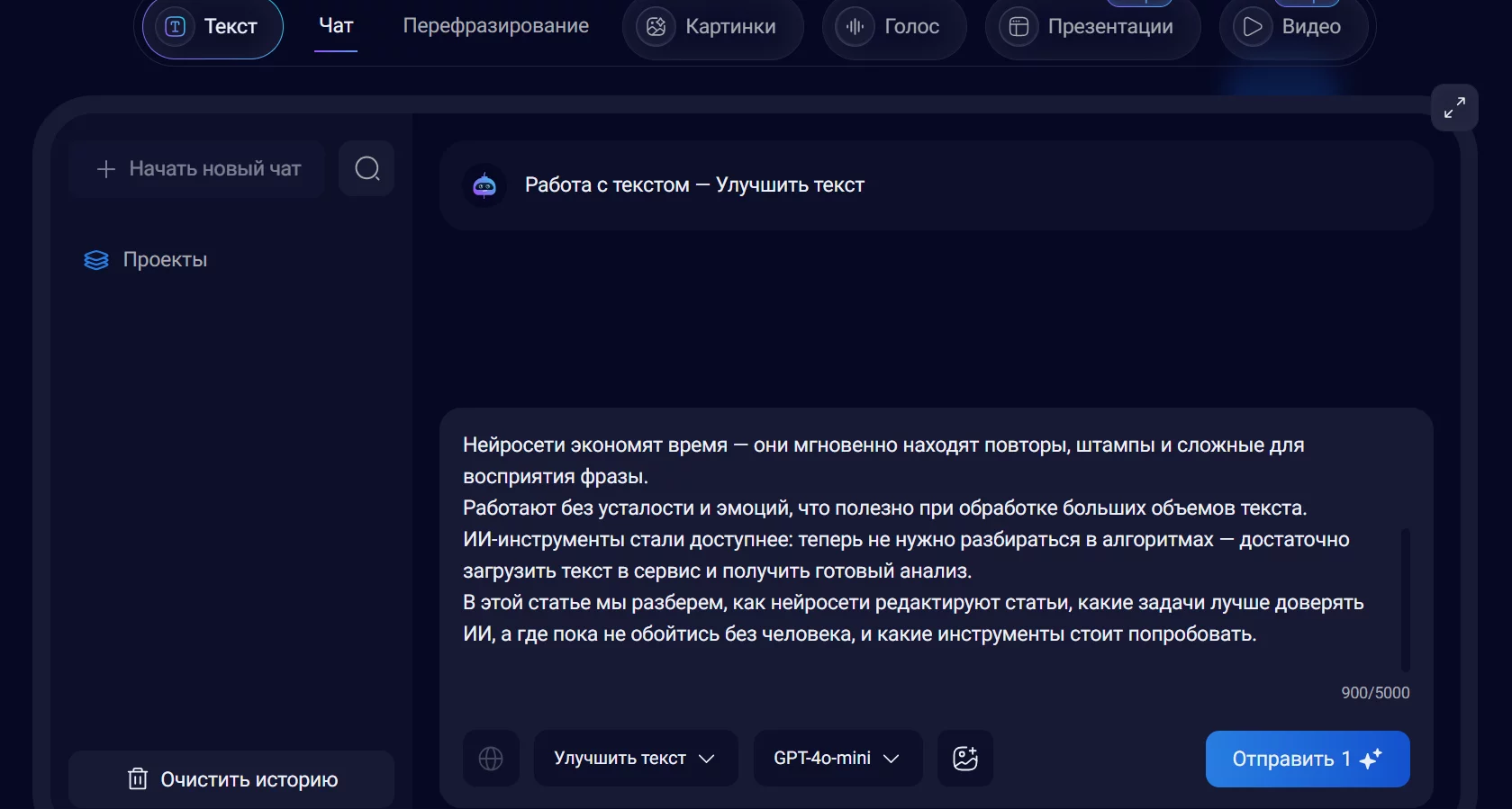 Скорость обработки. Нейросети анализируют текст в разы быстрее человека — проверка орфографии, стиля и структуры занимает секунды, даже для объемных документов. Это особенно ценно при жестких дедлайнах или необходимости обрабатывать множество материалов ежедневно.