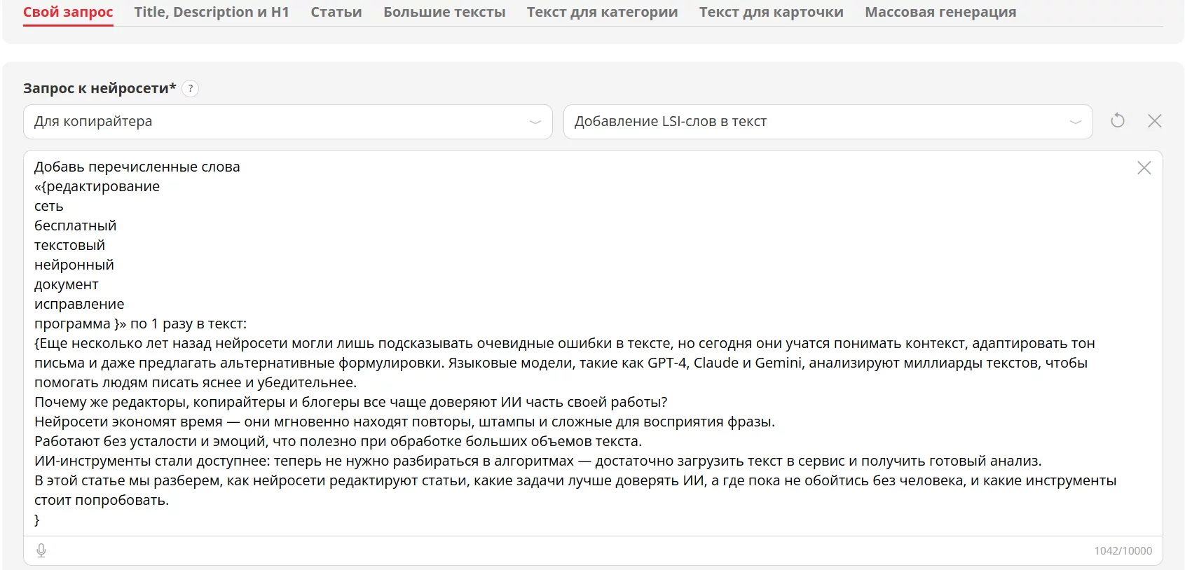 Ссылка: https://tools.pixelplus.ru/ai-content/text-editor/