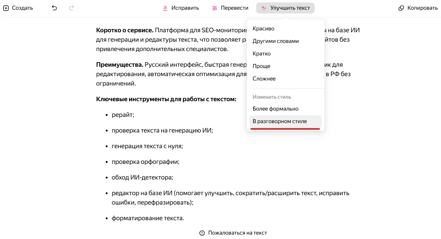 - рерайт с опциями улучшения текста (красиво, другими словами, кратко, проще, сложнее, более формально, в разговорном стиле);
