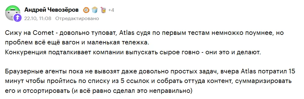 - Проблемы с производительностью. Пользователи отмечают, что использование ChatGPT Atlas в агентском режиме замедляет процессы и быстрее высаживает батарею макбука.