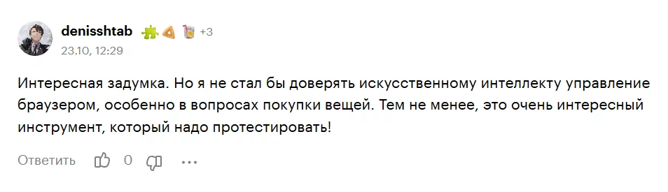 - Существует угроза конфиденциальности. Глубокая интеграция ИИ с браузером и доступ к личным данным пользователя вызывают опасения. Также браузер уязвим к промт-инъекциям — скрытым вредоносным нейросетевым командам. Они могут встречаться в документах и заставлять ИИ-агента совершать указанные в них действия.