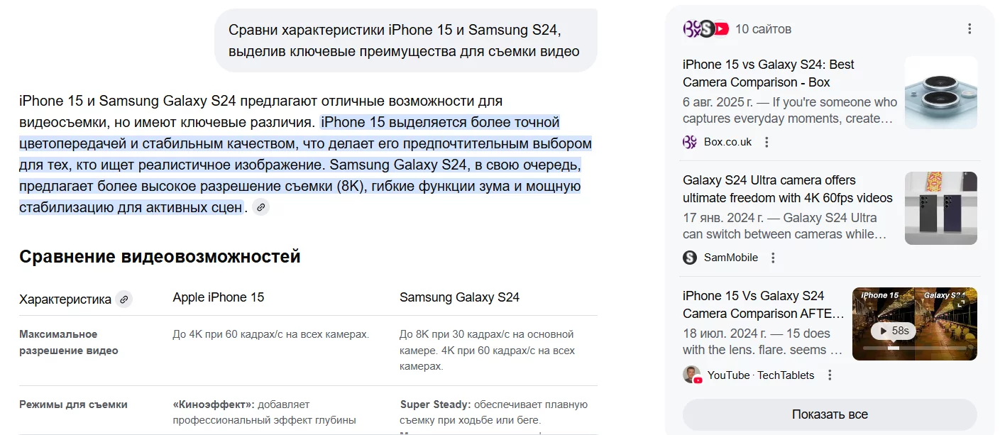 Забудьте о простых запросах и десятке синих ссылок. Здесь вы ведете диалог с поисковой системой, как с ассистентом. Вы можете задать сложный, комплексный вопрос, например: «Сравни характеристики iPhone 15 и Samsung S24, выделив ключевые преимущества для съемки видео». В ответ вы получите готовую, структурированную сводку: четкое сравнение стабилизации, разрешения, форматов видео и качества звука, составленное на основе анализа технических обзоров, форумов и новостных статей.