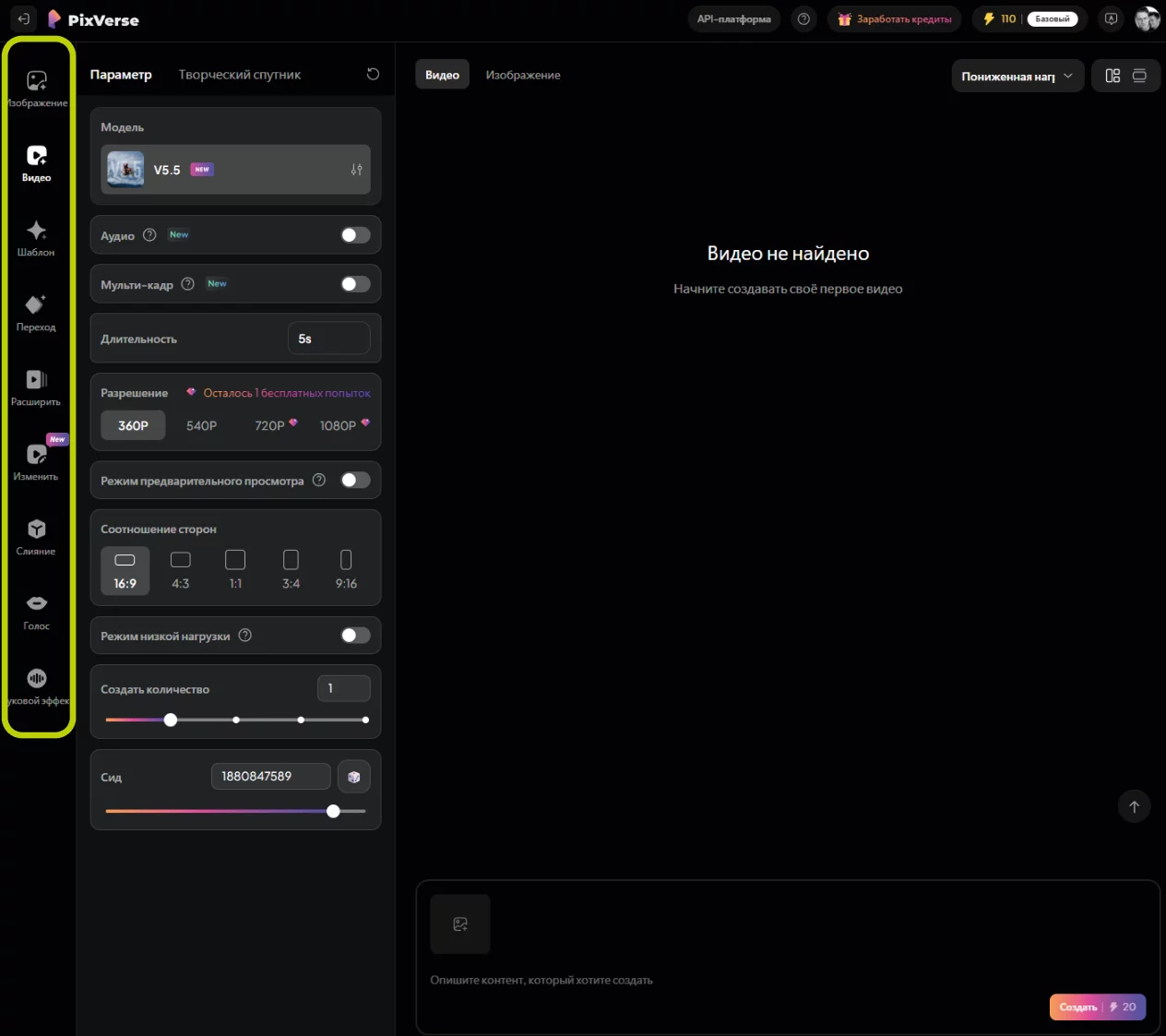Интерфейс Pixverse построен вокруг главной панели внизу экрана — она идет с вами по всем разделам. Здесь собраны основные инструменты создания контента. Слева — меню разделов: главная страница с работами других пользователей, ваши проекты, эффекты, настройки аккаунта.