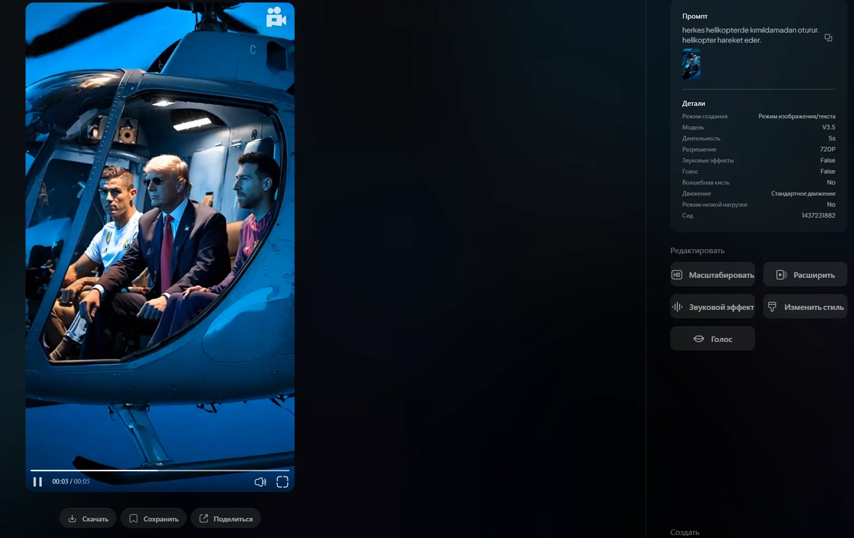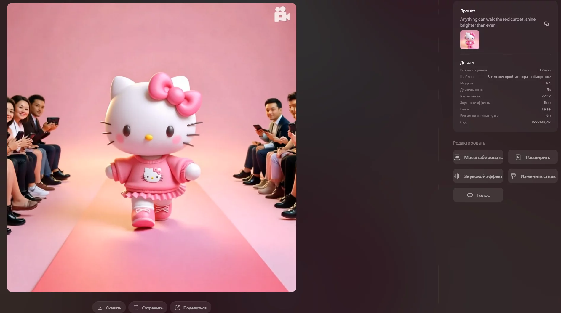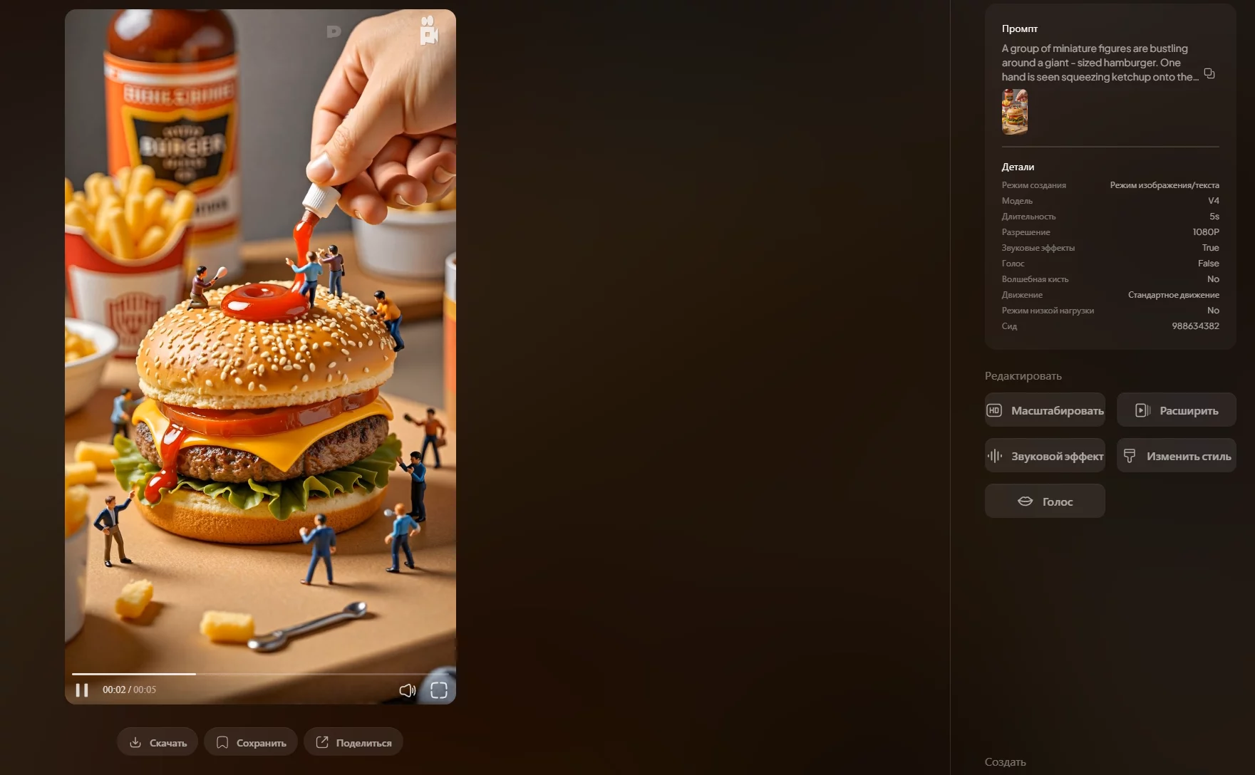 Результат можно сразу скачать, поделиться или доработать — добавить звук, изменить стиль, расширить длительность. А еще полезная фишка: в каждом видео показан промпт, который использовали для создания. Можно подсмотреть удачные формулировки у других пользователей.