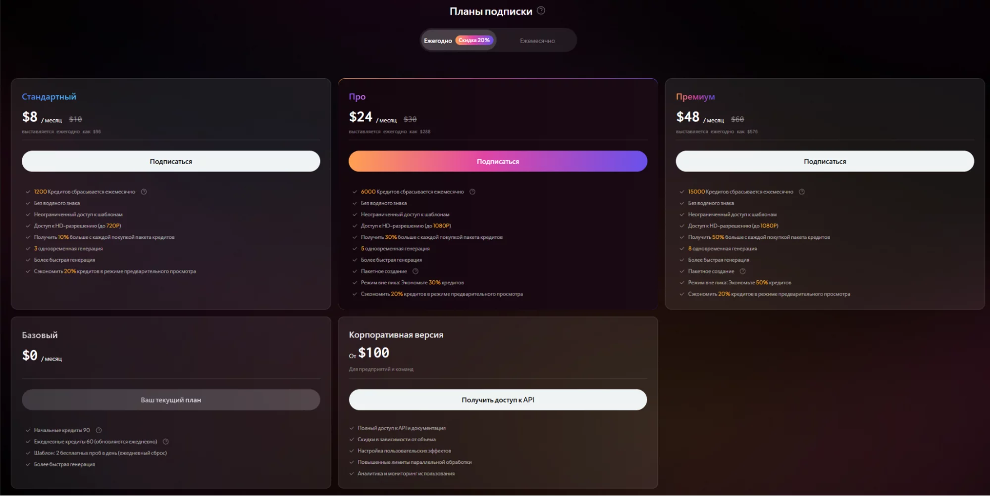 Для старта базового тарифа за $ 8 может хватить. Получаете 1200 токенов в месяц — как в бесплатном тарифе, только сразу. Плюс видео без водяных знаков. Для SMM-менеджера или контент-мейкера это разумная инвестиция.
