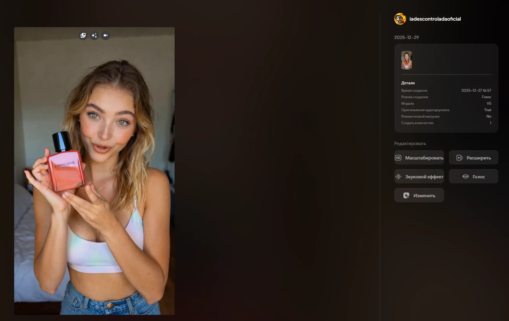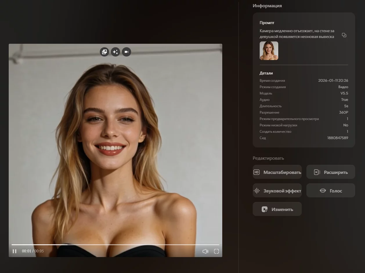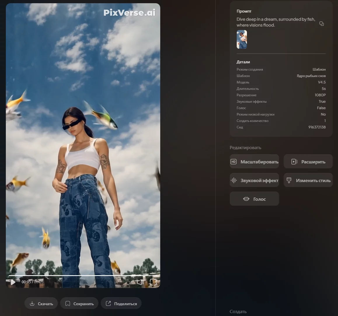 Шаг 5. Масштабирование (опционально). Если результат понравился, но качество низкое — не нужно генерировать заново. В карточке готового видео нажмите «Редактировать» → «Масштабировать». Pixverse увеличит разрешение без повторной генерации. Это экономит токены: можно сначала создать несколько вариантов в 360P, выбрать лучший и масштабировать только его до 720P или 1080P.