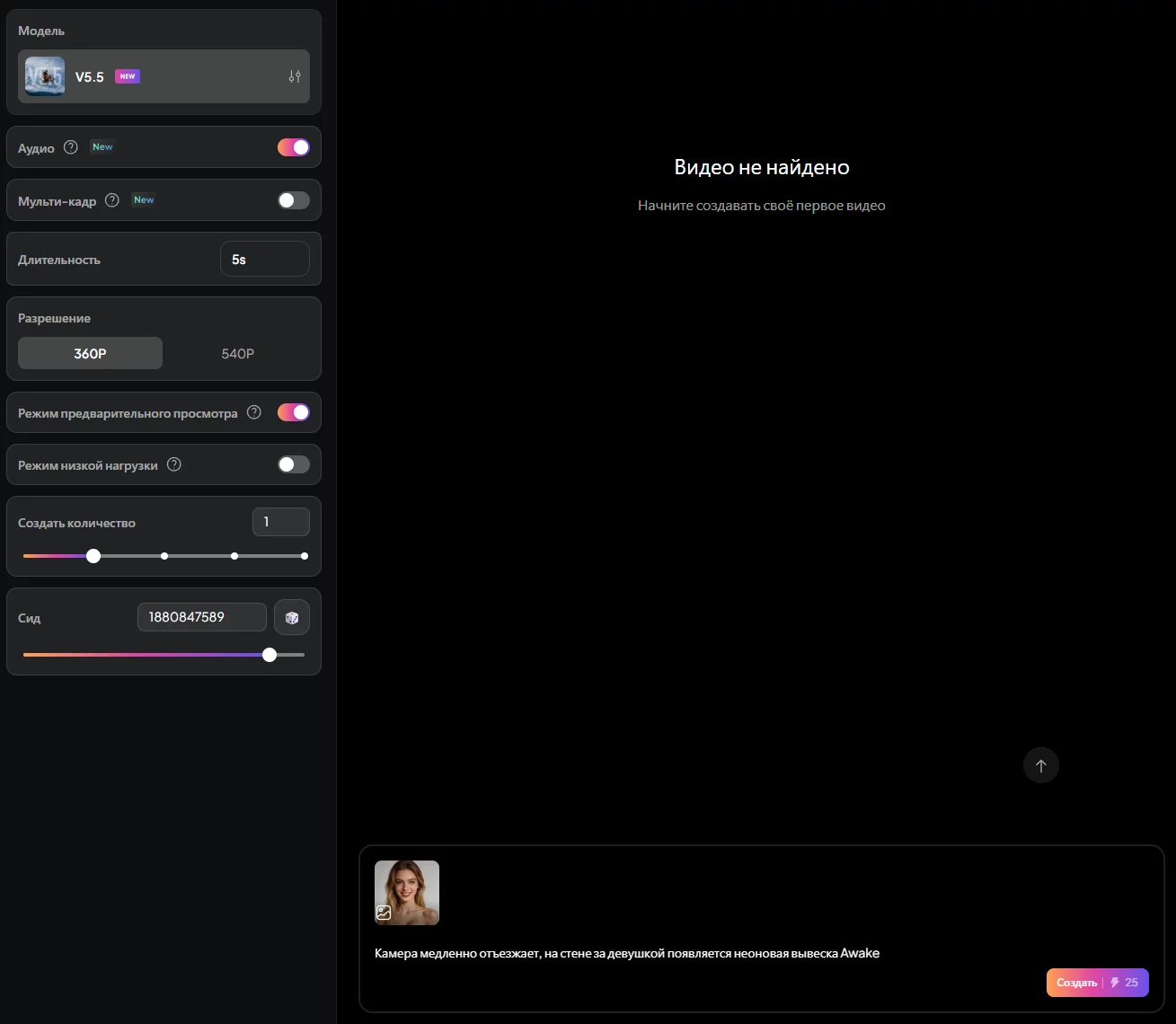 Шаг 2. Пишу промпт. Например: «Камера медленно отъезжает, на стене за девушкой появляется неоновая вывеска Awake». Чем конкретнее описание, тем предсказуемее результат.