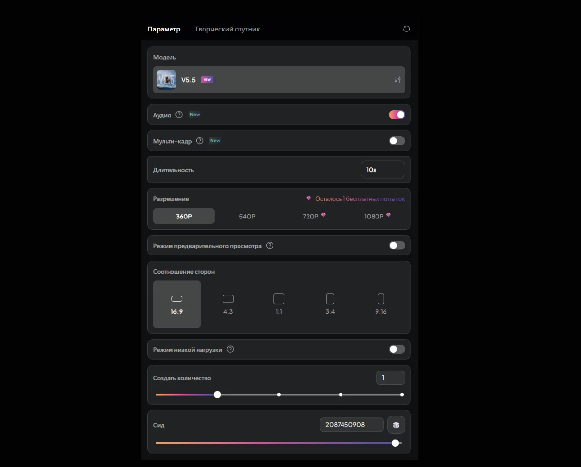 Создать количество — сколько вариантов видео сгенерировать за раз (от 1 до 4). Удобно для сравнения разных результатов.