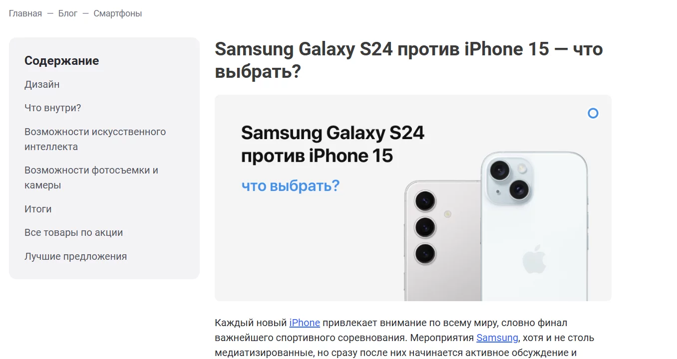 - «Сравнить iPhone 15 и Samsung S24» — информационно-коммерческий запрос. Пользователь на стадии выбора. Его нужно привести в статью-обзор или сравнение, где в конце будет CTA (призыв к действию) с ссылками на оба товара.