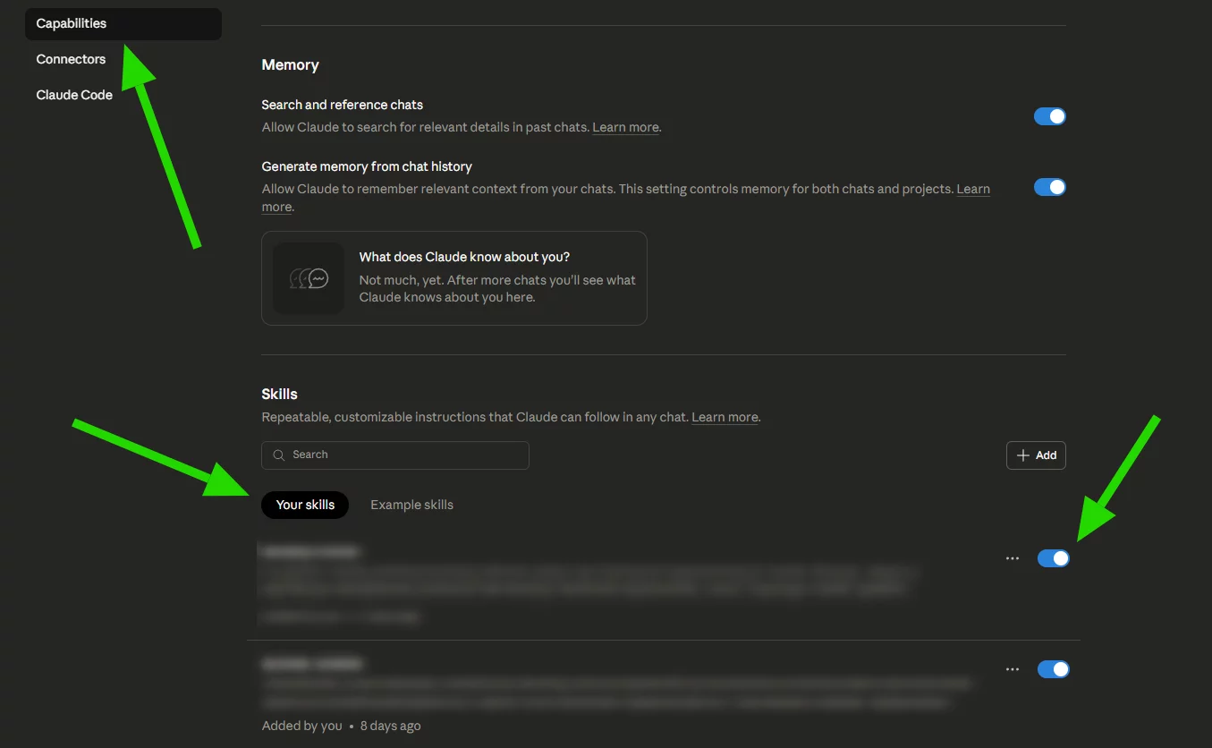Откройте Claude.ai → Настройки (Settings) → Возможности (Capabilities) → раздел Skills → «Загрузить навык» (Upload skill). Выберите ваш ZIP-файл.