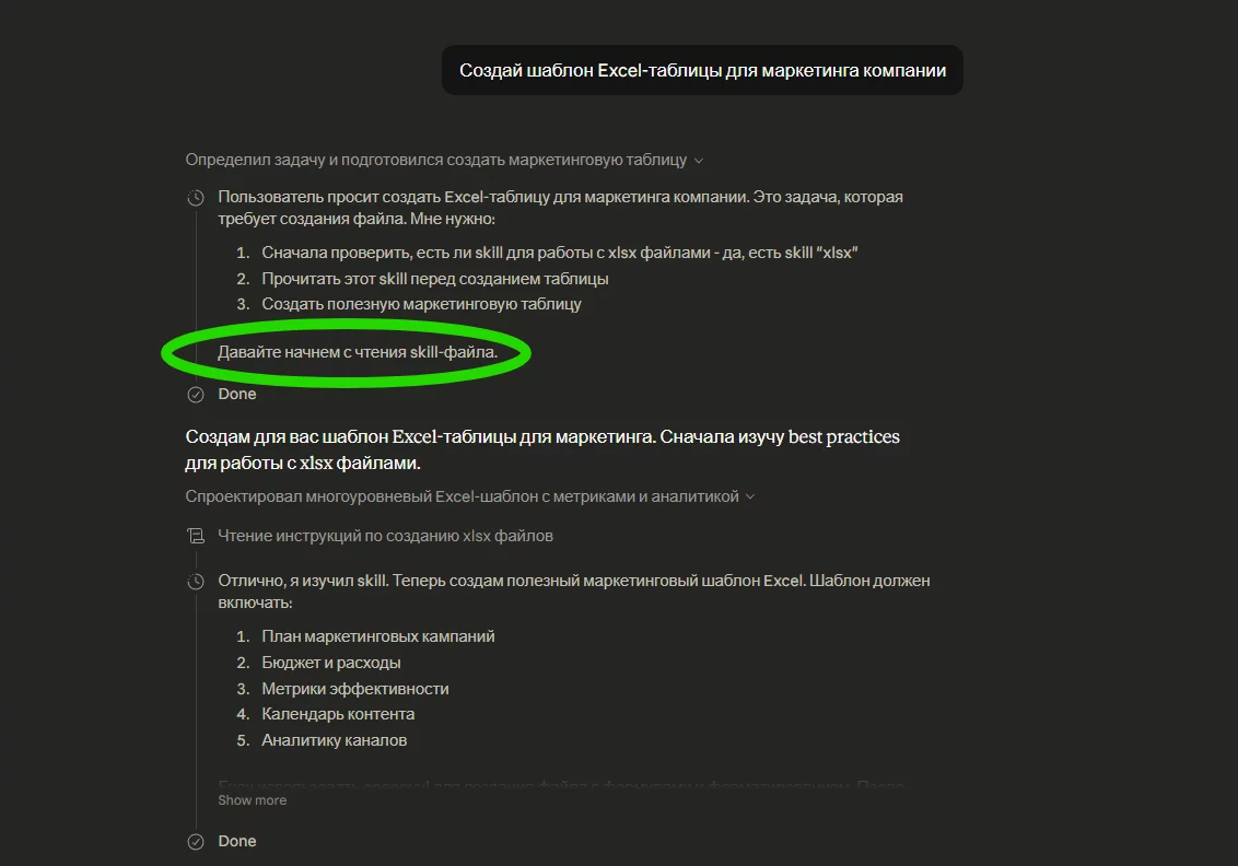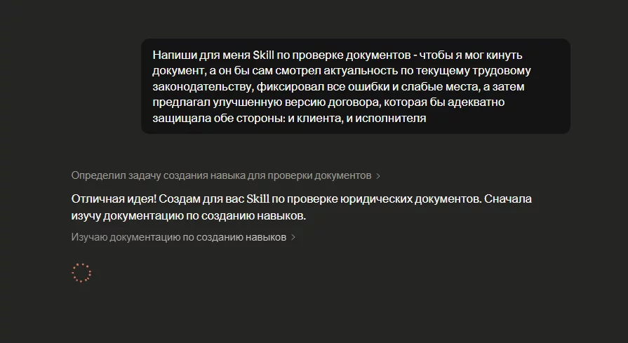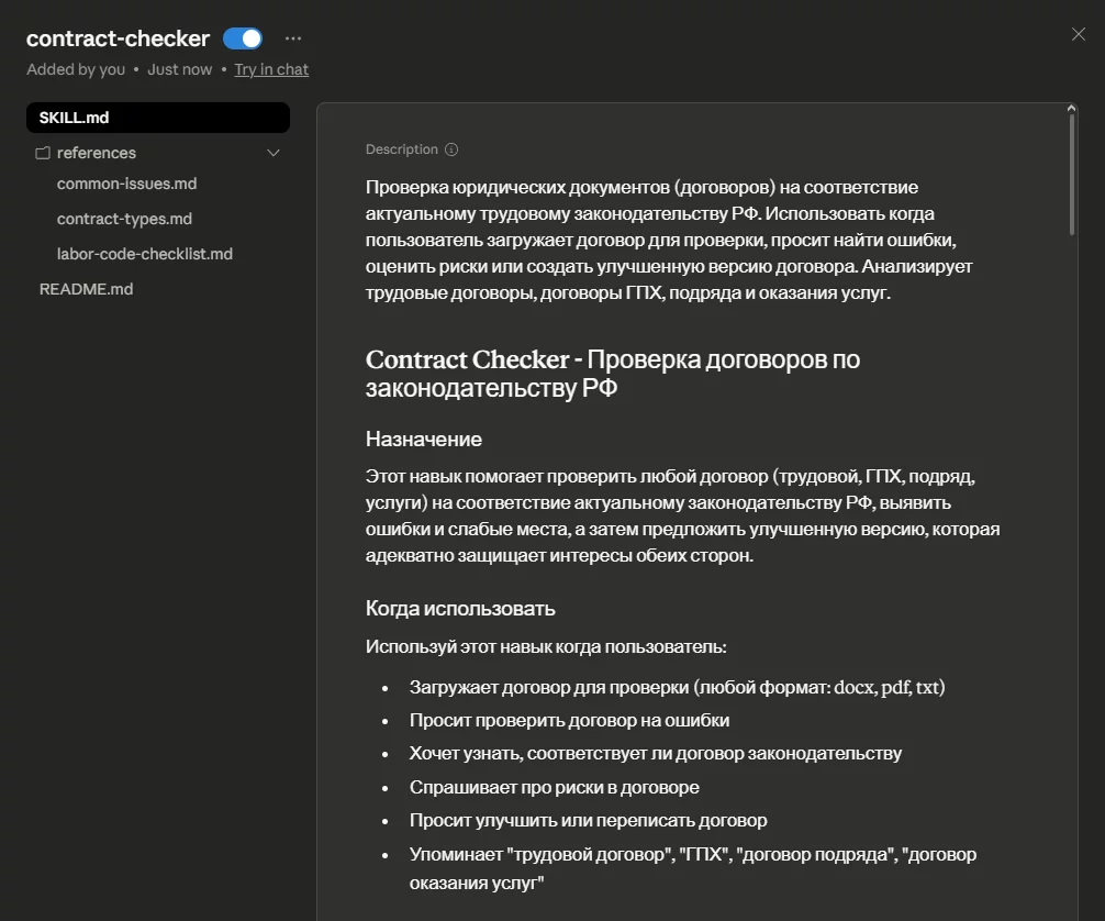Начните новый чат и дайте задачу, которая соответствует описанию навыка. Если всё работает — Claude автоматически подтянет ваш Skill и применит инструкции без дополнительных напоминаний.