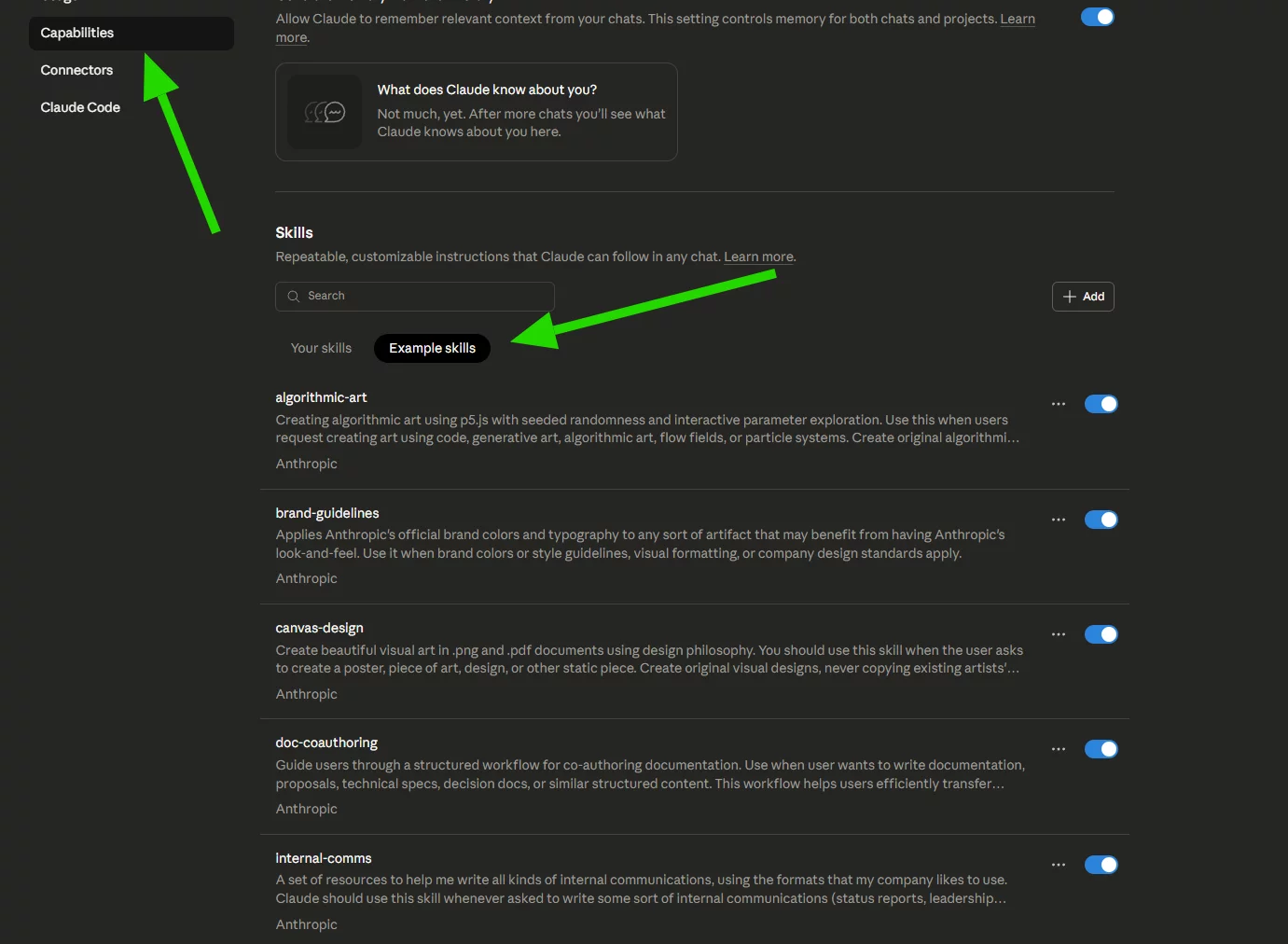 Кроме того, Anthropic предлагает примеры навыков (example skills) — их нужно включить вручную в настройках. Это готовые навыки для демонстрации возможностей: генерация алгоритмического искусства, применение брендбука, создание GIF для Slack и другие. Каждый можно включить или выключить переключателем.