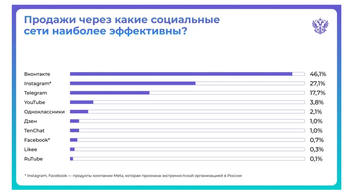 Соцсети — одна из точек роста электронной коммерции в России. В 2024 году Минэкономразвития провело исследование «Продвижение бизнеса через социальные сети» (опрос 4 000 представителей малого и среднего бизнеса из разных регионов РФ), вот его основные тезисы: