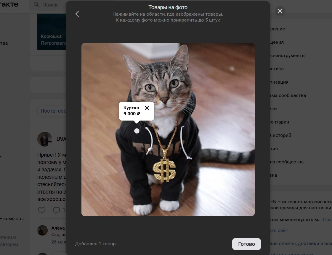 - Товары в сообществах. Базовая и самая популярная функция, позволяющая создать каталог прямо в группе.